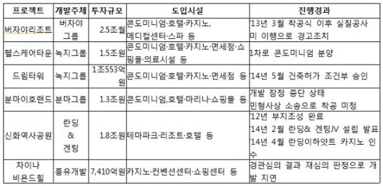 문제는 이들 중국 자본 중심의 개발 프로젝트들이 수익성을 위해 대부분 카지노를 포함하고 있다는 점이다. 이 때문에 제주도민들 사이에선 무분별한 외자 진입에 따른 난개발과 시장 혼란이 우려되고 있다. 중국 자본들이 카지노를 설립한 후 수익만 쫓아 계획된 투자를 이행하지 않거나 수익을 제주도에 환원하지 않을 경우 상실감이 클 것이라는 우려다.