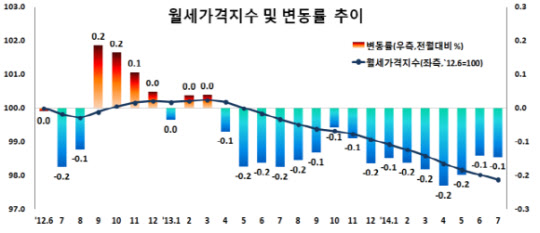서울에서는 강북지역이 0.1% 낮아졌다. 월세선호 현사으로 공급이 늘고 일부 대학가에서는 방학으로 인해 수요가 줄었기 때문이다. 강남은 0.2% 떨어졌는데 소형주택 공급이 늘고 아파트, 연립·다세대 주택 월세전환이 많이 이뤄진 영향이다.