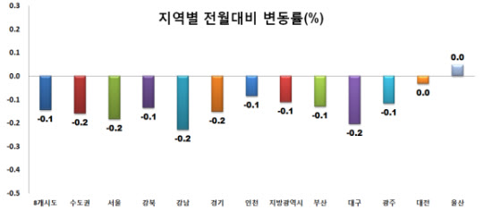 지역별로 보면 수도권에서는 서울(-0.2%), 경기(-0.2%), 인천(-0.1%)이 모두 하락했다.