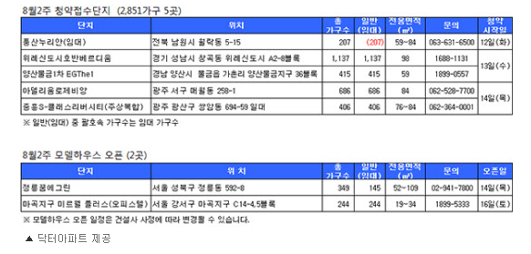 10일 부동산정보업체 닥터아파트에 따르면 이번 주에는 5개 단지 2851가구가 분양한다. 견본주택(모델하우스)은 2곳에서 문을 연다. 당첨자 발표는 4곳, 계약은 3곳에서 이뤄진다.