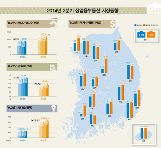 매장용빌딩은 세월호 참사 여파로 줄어들었던 1분기 민간소비가 개선됐지만 임대수요와 공급 불균형 영향으로 전분기와 비슷한 수준에 머물렀다.